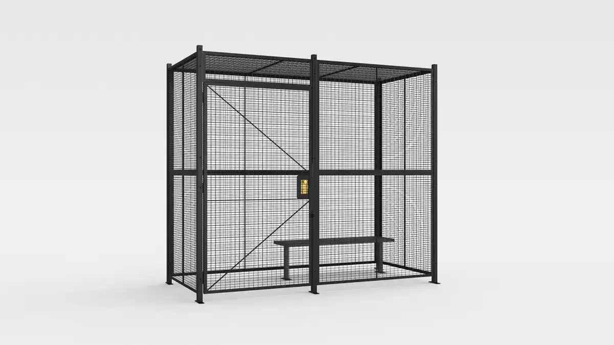 Detainees are secured in the holding cell by a hinged door with a safe lock system. The holding cell is completed with ceiling panels made of the same material, and our unique design restricts access to any hardware from the secure side of the holding cell enclosure. The wire partition holding cell system is easily installed using conventional hand tools and 3/8" assembly hardware. Our open yet secure design permits unrestricted circulation of the holding cell's existing lighting, HVAC, and fire suppression equipment. For establishments that require increased security, heavy duty alternatives are available.